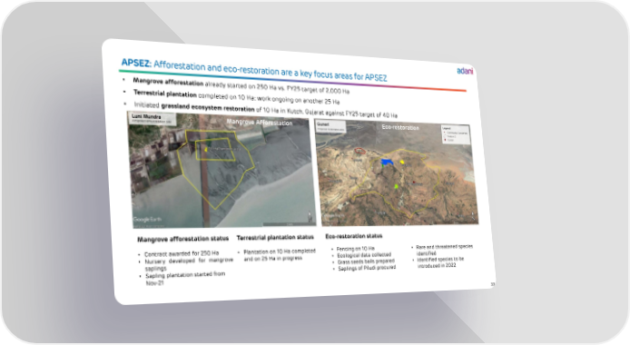 Mangrove afforestation status • Contract awarded for 250 Ha • Nursery developed for mangrove saplings • Sapling plantation started from Nov - 21 Luni Mundra Proposed afforestation site Eco - restoration status Terrestrial plantation status • Plantation on 10 Ha completed and on 25 Ha in progress • Fencing on 10 Ha • Ecological data collected • Grass seeds balls prepared • Saplings of Piludi procured • Rare and threatened species identified • Identified species to be introduced in 2022 Mangrove Afforestation Eco - restoration • Mangrove afforestation already started on 250 Ha vs. FY25 target of 2,000 Ha • Terrestrial plantation completed on 10 Ha; work ongoing on another 25 Ha • Initiated grassland ecosystem restoration of 10 Ha in Kutch, Gujarat against FY25 target of 40 Ha APSEZ: Afforestation and eco - restoration are a key focus areas for APSEZ 33