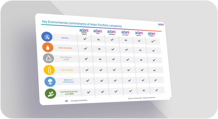 Key Environmental commitments of Adani Portfolio companies 11 ` Net Zero Water Neutrality Zero Waste to Landfill SUP Free Sites Mangrove / Afforestation Zero Biodiversity Net Loss (IBBI) No stated commitment Airports & Data Center : Operational Net Zero * Ports and Logistics Power Transmission Renewables Total Gas Enterprises NC NC NC NC NC NC NC NC NC