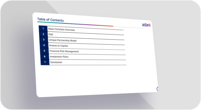 Portfolio Overview Page 1 Page 3Table of Contents 1 Adani Portfolio Overview 2 ESG 3 Unique Partnership Model 4 Access to Capital 5 Financial Risk Management 6 Investment Plans 7 Conclusion
