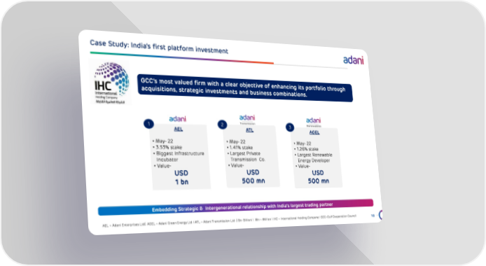 Case Study: India’s first platform investment 18 GCC’s most valued firm with a clear objective of enhancing its portfolio through acquisitions, strategic investments and business combinations. AGEL • May - 22 • 1.26% stake • Largest Renewable Energy Developer • Value - USD 500 mn 3 AEL – Adani Enterprises Ltd| AGEL – Adani Green Energy Ltd I ATL – Adani Transmission Ltd | Bn - BillionI I Mn – Million I IHC – International Holding Company I GCC – Gulf Cooperation Council ATL • May - 22 • 1.41% stake • Largest Private Transmission Co. • Value - USD 500 mn 2 AEL • May - 22 • 3.53% stake • Biggest Infrastructure Incubator • Value - USD 1 bn 1 Embedding Strategic & Intergenerational relationship with India’s largest trading partner