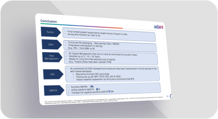 Conclusion 34 – Fully funded growth supported by largest Equity Program in India – Across the Portfolio for USD 16 bn – Continued De - leveraging – Reduced Net Debt / EBIDTA – Progressive improvement in Ratings (e.g.: APL – from BBB - to A) – All Capital Management Plan are on track as committed during past 3 years – Detailed up to 5 – 10 – 30 Years – Based on Long Term Risk adjusted cost of capital (e.g.: Treasury Rate have been used @ 3.75%) – As committed full ESG framework and measures have been implemented in all the verticals in line with Global standards – Assurance through CRC committee – Disclosures as per SBTi, TCFD, SDG, GRI & UNGC – Impact baseline assessment by third party consultants like BCG Equity Debt Risk Management ESG EBIDTA – Portfolio EBIDTA 26% – Utility platform EBIDTA 26% – Transport & Logistics portfolio EBIDTA 19% ESG - Environment Social Governance I EBIDTA – Earning Before Interest Depreciation Tax Appropriation I SBTi - Science Based Targ ets initiative I TCFD - Task Force on Climate - related Financial Disclosures I SDG - Sustainable Development Goals I GRI - Global Reporting Initiative I UNGC - United Nations Global Compact I BCG – Boston Consultancy Group