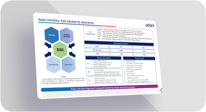 Adani Portfolio: ESG backed by assurance 10 Guiding principle Policies ESG Assurance Commitment Vision To be a world class leader in businesses that enrich lives and contribute to nations in building infrastructure through sustainable value creation . Guiding principles UNGC SDG TCFD IBBI CDP SBTi GRI Standard BRSR DJSI • APSEZ – Carbon Neutral, Water Positive, ZWL, SUP Free, Zero Accident • ATL – Water Neutral, ZWL, SUP free, No Biodiversity Net Loss, Zero Accident • AGEL – Water Neutral, SUP free, No Biodiversity Net Loss, Zero Accident • ATGL – Zero Accident, Customer centricity • APL – SUP free, Zero Accident, No Biodiversity Net Loss, Natural resource conservation • AEL – Zero Accident, Natural resource conservation, Water neutral Our Commitment • Environment Policy • Energy and Emission Policy • Water Stewardship Policy • Biodiversity Policy • Climate Action • Affordable and clean energy • Clean water and sanitation • Responsible consumption • Biodiversity conservation • No poverty • Zero hunger • Good health and well being • Quality education • Decent work and economic growth • Industry, innovation & infrastructure Policy Structure Focus Area • Human Rights • Corporate Social Responsibility Policy • Occupational Health and Safety Policy • Board Diversity • Anti - corruption and anti - bribery • Related Party Transaction Policy E S G Policy and ESG Alignment framework backed by robust assurance program APSEZ: Adani Ports and Special Economic Zone Limited; ATL: Adani Transmission Limited; AGEL: Adani Green Energy Limited; ATGL: Adani Total Gas Limited; APL: Adani Power Limited; AEL : Adani Enterprises Limited; ZWL: Zero Waste to Landfills; SUP: Single - Use Plastics; UNGC: United Nations Global Compact; SDG: Sustainable Development Goals; SBTi: Science Based Targets; GRI: Global Reporting Initiative BRSR: Business Responsibility and Sustainability Report; DJSI: Dow Jones Sustainability Indices; TCFD: Task Force on Climate - Rel ated Financial Disclosures; IBBI: India Business and Biodiversity Initiatives