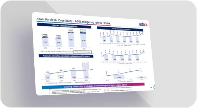 Adani Portfolio - Case Study - AGEL mitigating rate & FX risk 28 Note – 1. Debt Outstanding = Closing INR Debt – Derivative assets/ Other comprehensive income – Hedge Reserve I Cash available for servicing = RG1 EBIDTA + RG2 EBIDTA + AGEL Holdco FCFE 2. Assumed the USD /INR Exchange rate for 11 th October, 2022 @ INR 82.39 is constant till 31 st March, 2023 Negative gap between unhedged and hedged servicing Positive gap between unhedged and hedged servicing 559 478 1,097 2,136 676 892 1,127 1,107 2020 2021 2022 2023 Total Servicing + MTM (if not hedged) Total Actual servicing Aligning the cash outflow and making it predictable through full hedging ...in fluctuating market environment 7,094 7,015 12,324 12,198 396 178 621 1,641 7,491 7,193 12,945 13,838 2020 2021 2022 2023 AGEL Debt o/s AGEL Unhedged notional Exposure AGEL Debt o/s (w/o hedge) Stable and predictable closing liability... Assuring a stable and predictable credit coverage in a highly volatile market 1.73 x 1.79 x 1.78 x 1.81 x 1.83 x 1.82 x 69.46 70.69 70.90 75.39 75.47 73.80 73.67 73.50 72.99 74.26 75.72 75.79 77.84 82.40 1.00 1.20 1.40 1.60 1.80 2.00 2.20 2.40 60.00 65.00 70.00 75.00 80.00 85.00 Jun-19 Sep-19 Dec-19 Mar-20 Jun-20 Sep-20 Dec-20 Mar-21 Jun-21 Sep-21 Dec-21 Mar-22 Jun-22 Dec-22 RG1 PLCR Ex Rate 1.78 x 1.79 x 1.80 x 1.81 x 1.75 x 71.32 75.39 76.27 73.80 73.27 73.50 75.17 74.26 75.30 75.79 76.22 82.40 1.00 1.20 1.40 1.60 1.80 2.00 2.20 2.40 64.00 66.00 68.00 70.00 72.00 74.00 76.00 78.00 80.00 82.00 84.00 Oct-19 Mar-20 Apr-20 Sep-20 Oct-20 Mar-21 Apr-21 Sep-21 Oct-21 Mar-22 Apr-22 Oct-22 RG2 PLCR Ex Rate 7.18 x 3.33 x 73.65 75.79 79.67 82.40 0.00 2.00 4.00 6.00 8.00 10.00 12.00 14.00 16.00 18.00 68.00 70.00 72.00 74.00 76.00 78.00 80.00 82.00 84.00 Sep-21 Mar-22 Sep-22 Mar-23 Debt/ FCFE Ex Rate