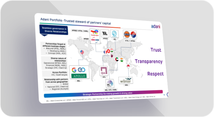 Adani Portfolio - Trusted steward of partners’ capital 16 AEL – Adani Enterprises Ltd | APSEZ – Adani Ports & SEZ Ltd | ATGL – Adani Total Gas Ltd | ATL – Adani Transmission Ltd | AGEL – Adani Green Energy Ltd | AWL – Adani Wilmar Ltd Strategic Partnership De - risking growth & driving value Seamless governance in Diverse Relationships Partnerships forged at different business stages - • Matured (ATGL, AEML) • Developing (AGEL) • Concept (ANIL, ACX) Diverse nature of relationships - Operational (APSEZ, AWL) Financial (AEML, AGEL) Strategic (IHC, Cleartrip ) Across Portfolio - IHC, TotalEnergies Relationship with partners from across geographies - • Global • National (IOC, Cleartrip ) • Regional (multiple) ATGL | APSEZ APSEZ I ATGL | AGEL APSEZ APSEZ AEL AWL AEL ATL AEL I ATL I AGEL Trust Transparency Respect